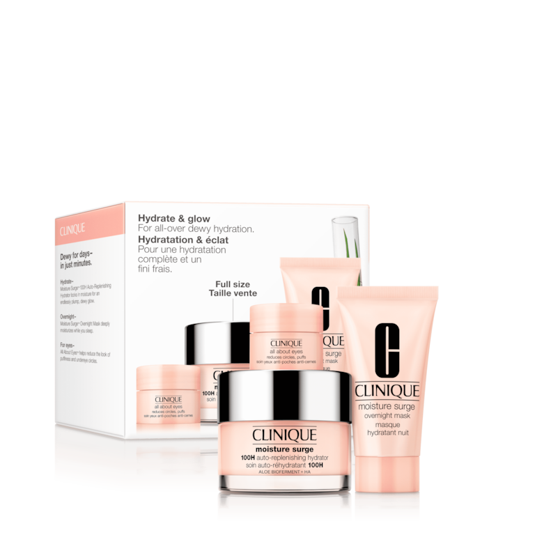 3 dei nostri prodotti skincare giorno e notte preferiti, per un’idratazione fresca e uniforme, incluso il nostro bestseller Moisture Surge™ 100H Hydrator in formato standard.